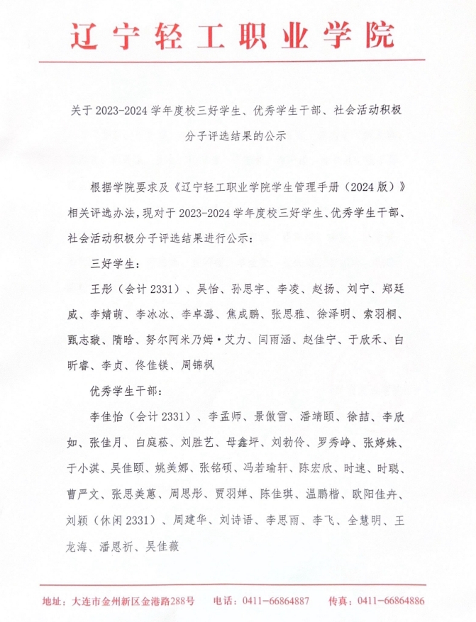 关于2023-2024学年度三好员工、优秀员工干部、社会活动积极分子评选结果的公示