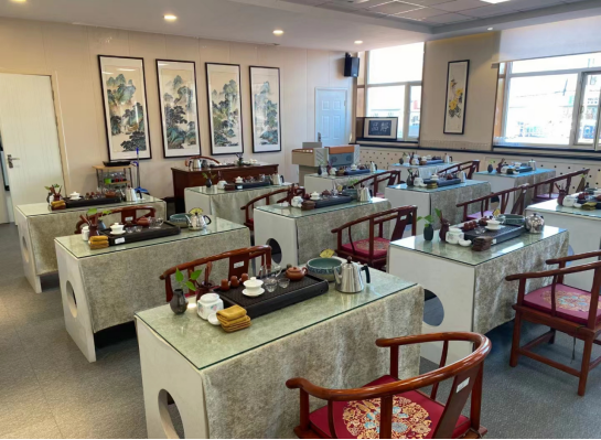 茶艺实训室面积约200余平方米,可满足60名员工同时使用。室内设备配置齐全,拥有多媒体教学设备、茶桌椅、各式茶盘、饮水机、各类茶具等设备设施。可以满足员工以及企业实训及讲座等。